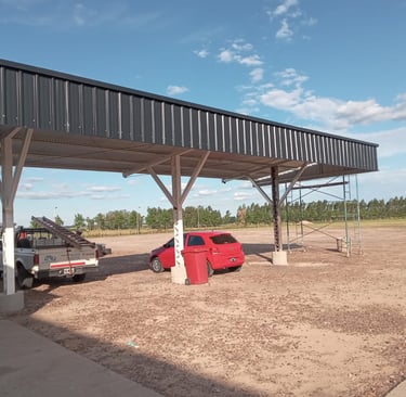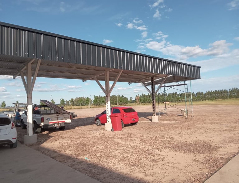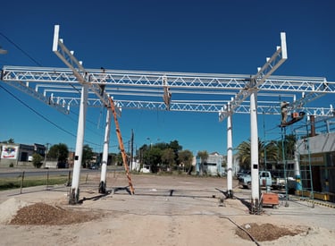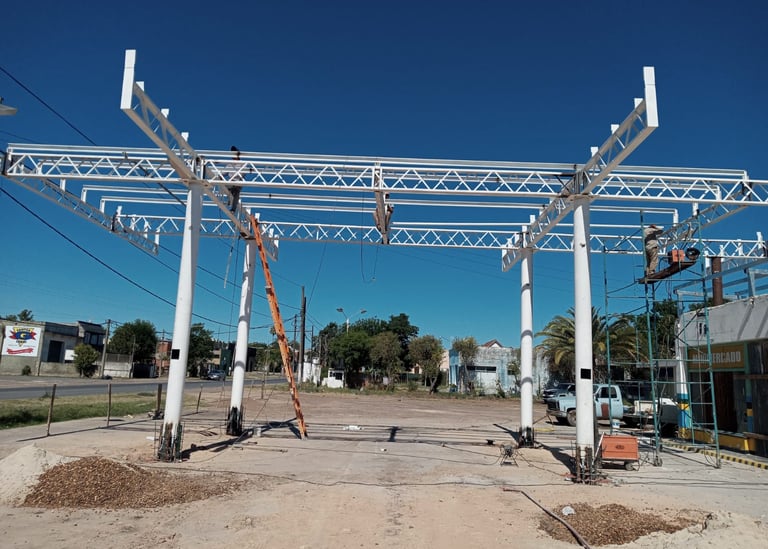 Estructura metálica principal para la Estación de Servicio La Posta, de 12 x 20 m. Los perfiles metálicos y el soporte están específicamente diseñados para integrar el techo cielorraso y la cenefa, asegurando una construcción sólida, resistente y adaptable al entorno operativo.